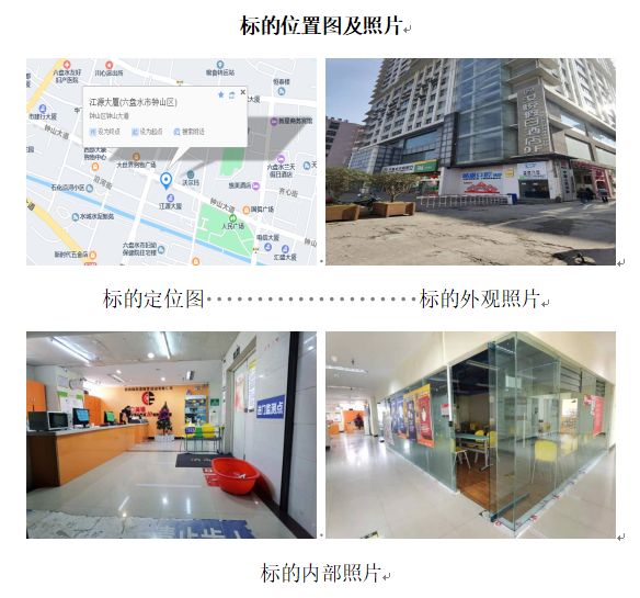 標(biāo)的位于六盤(pán)水市鐘山區(qū)鐘山中路46號(hào)江源大廈5層501室的商業(yè)房地產(chǎn),建筑面積為1232.86㎡,樓幢總層數(shù)為27層,所在樓憧為鋼筋混凝土結(jié)構(gòu),建成于2010年。