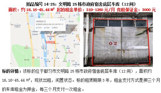 13、文明路25棟市政府宿舍底層車庫(12間)3年租賃權(quán)(面積約18.16㎡-45.44㎡)。
