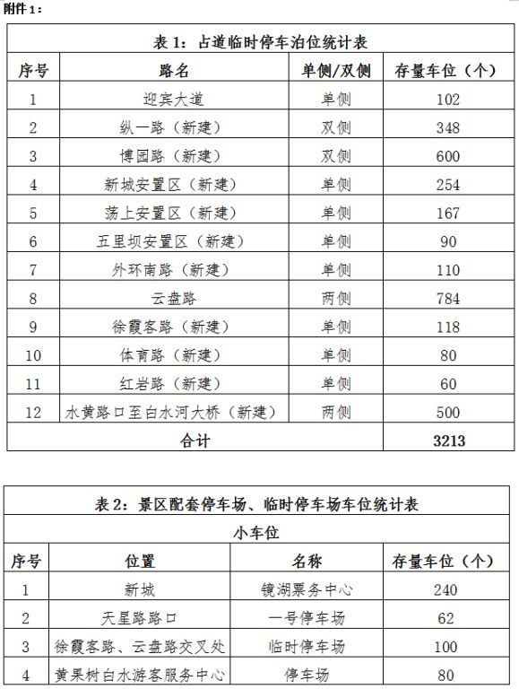 2.該標(biāo)的共計(jì)車位車9132個(gè),出讓年限18年(含1年建設(shè)期),其中占道臨時(shí)停車泊位3213個(gè),景區(qū)配套停車場、臨時(shí)停車場車位5919個(gè),停車位分布詳見附件1(表1、表2),停車位具體收費(fèi)標(biāo)準(zhǔn)詳見:黃管委發(fā)〔2019〕7號黃果樹旅游管理委員會(huì)關(guān)于印發(fā)《黃果樹旅游區(qū)停車場收費(fèi)管理辦法》的通知。