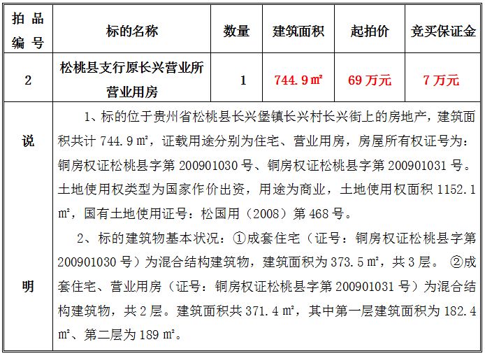2、松桃縣支行原長興營業(yè)所營業(yè)用房,建筑面積共:744.9㎡;起拍價:69萬元;競買保證金:7萬元