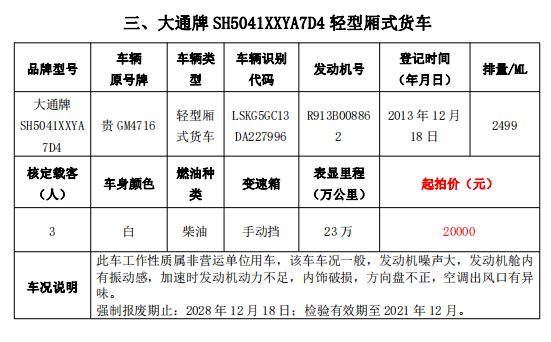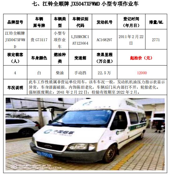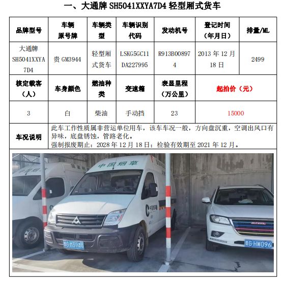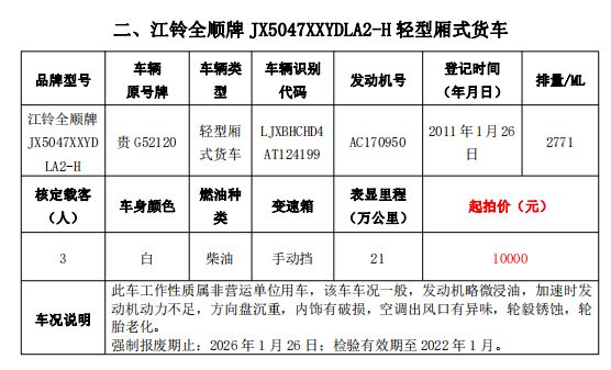 受委托,我公司于2021年12月14日(星期二)下午14:30在貴州省貴陽(yáng)市中華南路20號(hào)新大陸數(shù)碼廣場(chǎng)10樓D座會(huì)議室公開拍賣以下標(biāo)的:大通牌SH5041XXYA7D4輕型廂式貨車2輛、大通牌SH5041XXYA6D4輕型廂式貨車1輛、江鈴全順牌JX5047XXYDLA2-H輕型廂式貨車2輛、江鈴全順牌JX5047XFWMD小型專項(xiàng)作業(yè)車1輛、五十鈴牌QL1020UGDSC輕型普通貨車1輛、獵豹牌CFA6470M3小型普通客車1輛、獵豹牌CFA6470LA小型越野客車1輛,共計(jì)9輛車整體拍賣。