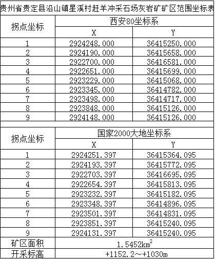 拍賣采礦權(quán)名稱貴定縣沿山鎮(zhèn)星溪村趕羊沖采石場(chǎng)灰?guī)r礦采礦權(quán),根據(jù)國(guó)土部門批準(zhǔn)劃定的礦區(qū)范圍,礦區(qū)面積為1.5452平方千米,開(kāi)采標(biāo)高+1152.2~+1030米,礦區(qū)拐點(diǎn)坐標(biāo)如下: