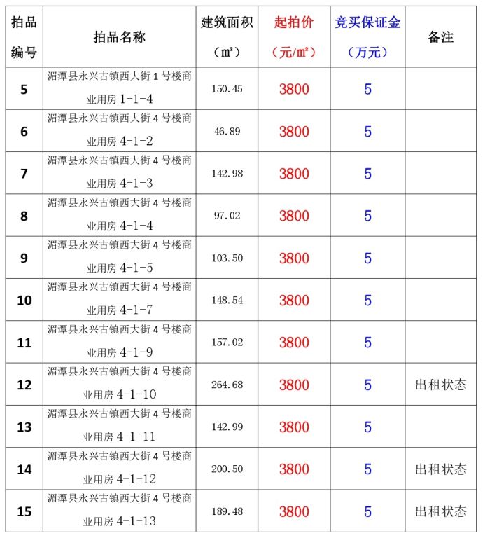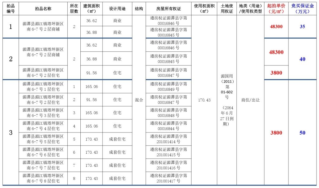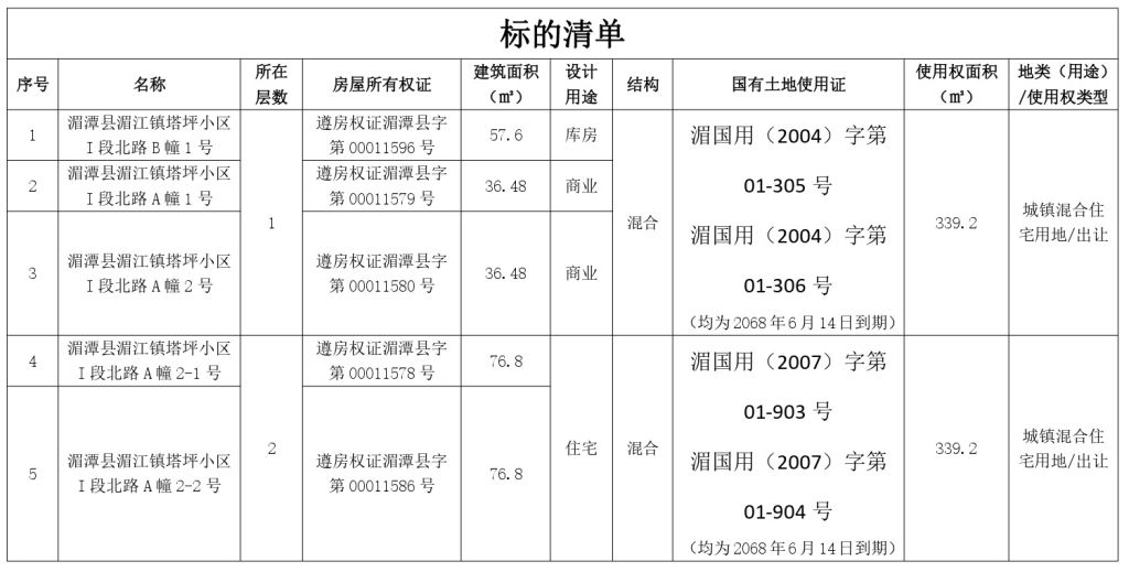 該批標(biāo)的位于湄潭縣永興鎮(zhèn)西大街臨街商鋪,共計(jì)11間(建筑面積:46.89㎡—264.68㎡)。標(biāo)的坐西向東,房屋結(jié)構(gòu)為框混結(jié)構(gòu),建成于2015年5月,水、電設(shè)施齊全;土地使用權(quán)年限為50年,截止日期至2059年11月。