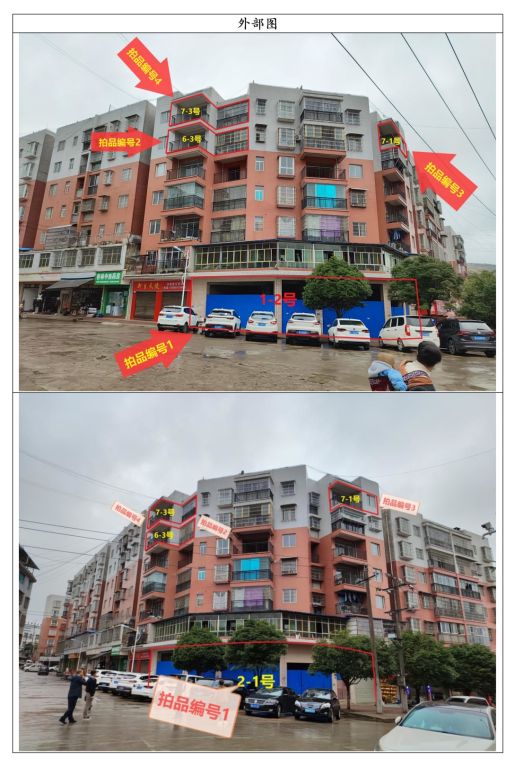 1、標(biāo)的坐落于甕安縣玉山鎮(zhèn)玉山街上欣隆苑小區(qū)二組團(tuán)6棟,標(biāo)的所在樓棟總層數(shù)為7層,拍品編號(hào)1位于第1層,層高為3.3米,兩面均臨街;拍品編號(hào)2位于第6層,拍品編號(hào)3和4位于第7層,層高均為2.8米,戶型皆為2室1廳1廚1衛(wèi),混合結(jié)構(gòu);照明、通訊、水電等配套設(shè)施齊全。周邊有玉山小學(xué)、郵政銀行、好樂購(gòu)購(gòu)物廣場(chǎng)、玉山農(nóng)貿(mào)市場(chǎng)等生活配套設(shè)施。