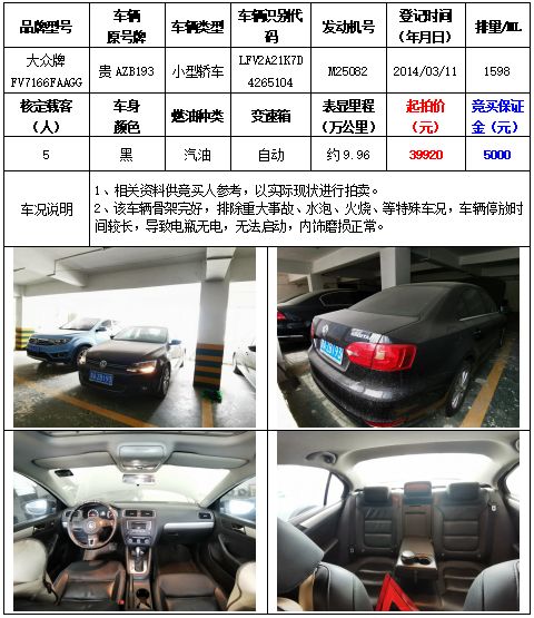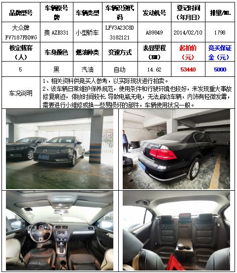 拍品編號(hào)1:大眾牌FV7166FAAGG小型轎車一輛