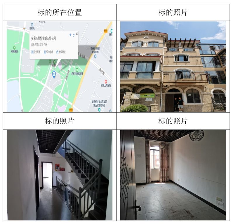 標(biāo)的位于安順市開發(fā)區(qū)幺鋪鎮(zhèn)大屯村多彩萬象旅游城,標(biāo)的房屋總樓層數(shù)為4樓,所在樓層為一躍四,一樓戶型為一廚一衛(wèi)一個大廳,二樓戶型為四個房間,兩個衛(wèi)生間,三樓為四個房間兩個衛(wèi)生間,四樓為兩個房間一衛(wèi)一個平臺。標(biāo)的有部分滲水情況,為毛坯房。