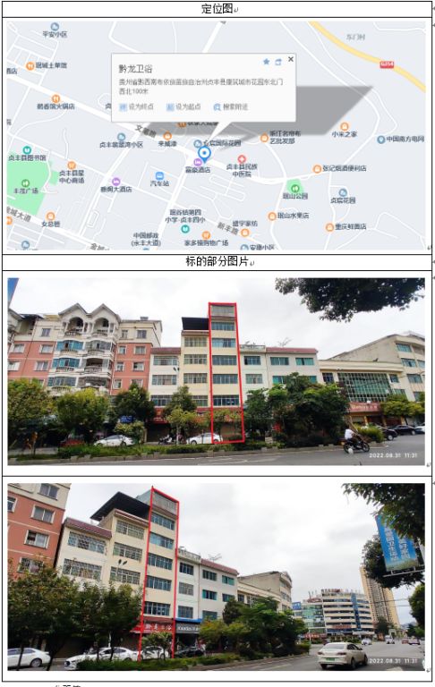標(biāo)的位于貞豐縣龍場(chǎng)鎮(zhèn)興龍商貿(mào)區(qū),房屋總層數(shù)為6層。產(chǎn)權(quán)證號(hào):貞房權(quán)證龍場(chǎng)鎮(zhèn)字第20120349號(hào)、貞國(guó)用2012第004022號(hào),房屋證載建筑面積2278.03㎡(實(shí)測(cè)面積2263.59㎡),其中商用建筑面積:1818.71㎡,住宅建筑面積:459.32㎡;規(guī)劃用途為商住,混合結(jié)構(gòu)。證載土地面積1152㎡(實(shí)測(cè)面積1183.74㎡),地類(lèi)用途為商住,使用權(quán)類(lèi)型為出讓?zhuān)恋厥褂脵?quán)終止日期為2058年9月6日。