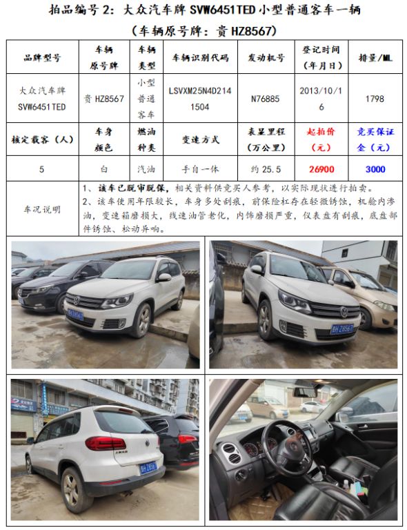 拍品編號(hào)2:大眾汽車牌SVW6451TED小型普通客車一輛(車輛原號(hào)牌:貴HZ8567);