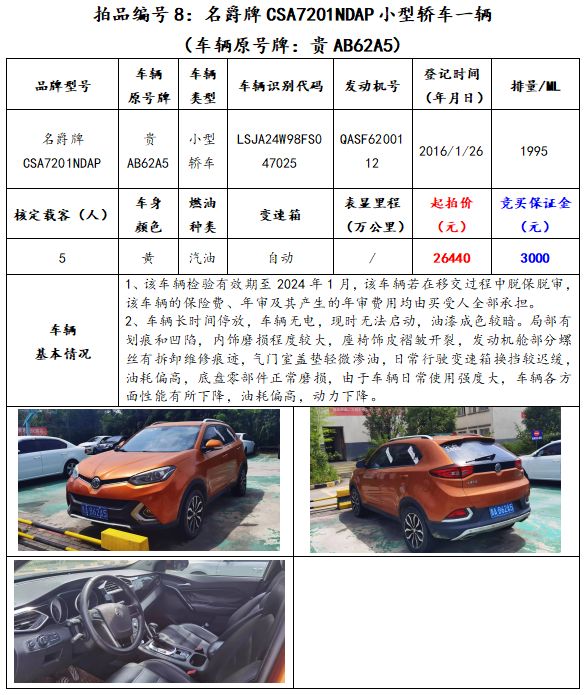 拍品編號(hào)8:名爵牌CSA7201NDAP小型轎車一輛(車輛原號(hào)牌:貴AB62A5);