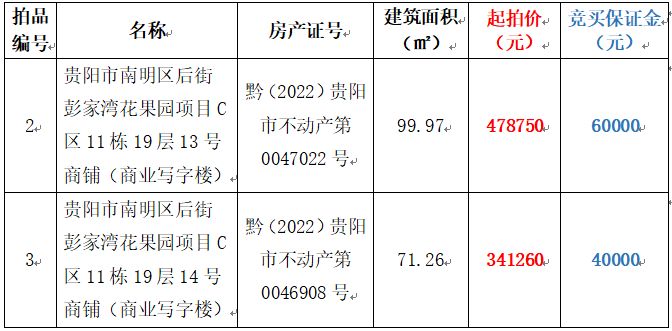 標(biāo)的位于貴陽市南明區(qū)花果園彭家灣花果園C區(qū)(貴陽國際中心1號(hào))11棟1單元19層13號(hào)、14號(hào)花果園商鋪(商業(yè)寫字樓),其中標(biāo)的2號(hào)建筑面積為99.97㎡、套內(nèi)面積為73.48㎡;標(biāo)的3號(hào)建筑面積為71.26㎡、套內(nèi)面積為52.38㎡。房屋為一般裝修,包含水電敷設(shè)及安裝、地面地磚、墻面刷瓷粉及乳膠漆、頂面鋁扣板吊頂、玻璃門。用途為辦公,鋼混結(jié)構(gòu),建成時(shí)間為2013年8月,所在層數(shù)19層,目前均為空置狀態(tài)。
