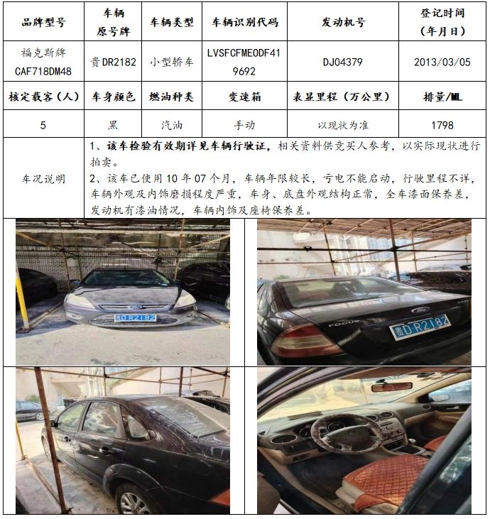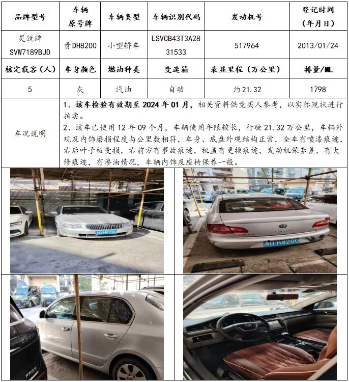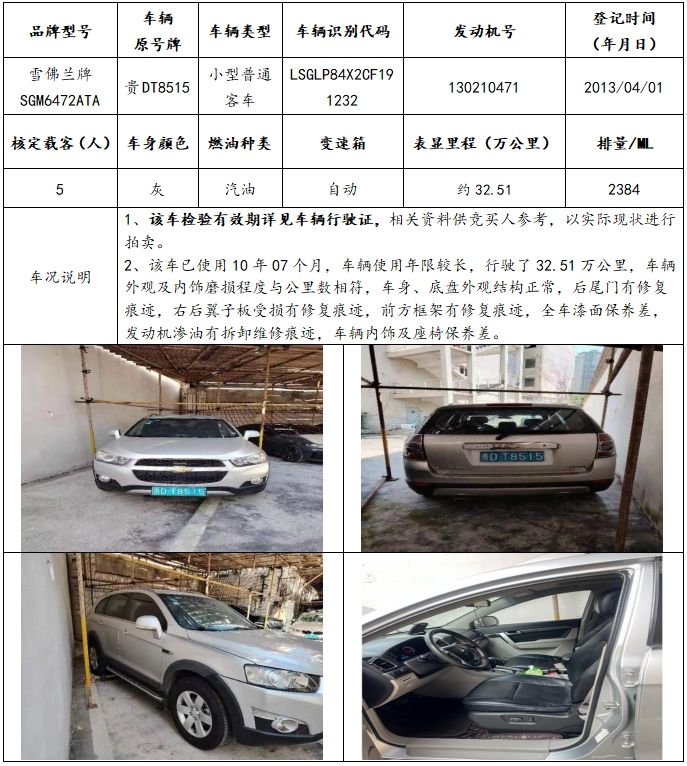拍品編號(hào)1:菲亞特牌、??怂古?、雪佛蘭牌、昊銳牌等共4輛(整體拍賣(mài))。一、展樣時(shí)間:公告之日起至2023年12月15日(工作日上午9:00—下午17:00)二、展樣地點(diǎn):標(biāo)的物所在地(請(qǐng)聯(lián)系我公司查看標(biāo)的)三、報(bào)名時(shí)間:公告之日起至2023年12月19日12:00(以保證金到賬時(shí)間為準(zhǔn)。)(https://paimai.caa123.org.cn/pages/meeting/conference.html?id=253855)1、請(qǐng)?jiān)谥信钠脚_(tái)上完成注冊(cè)登記,并上傳有效身份證明進(jìn)行實(shí)名認(rèn)證(個(gè)人:身份證原件;企業(yè):營(yíng)業(yè)執(zhí)照、法人身份證照片)2、意向競(jìng)買(mǎi)人應(yīng)在規(guī)定報(bào)名時(shí)間內(nèi)交納競(jìng)買(mǎi)保證金及資料服務(wù)費(fèi)300元/輛(資料服務(wù)費(fèi)不退)到我公司指定銀行賬戶(hù),取得競(jìng)買(mǎi)資格。戶(hù)名:貴州春秋拍賣(mài)有限責(zé)任公司賬號(hào):11810120540001264開(kāi)戶(hù)行:貴陽(yáng)銀行匯通支行六、其他說(shuō)明:為保證報(bào)名成功,避免轉(zhuǎn)賬失敗等情況,競(jìng)買(mǎi)人轉(zhuǎn)賬后請(qǐng)及時(shí)與我公司聯(lián)系,確認(rèn)其競(jìng)買(mǎi)資格。七、公司地址:貴州省貴陽(yáng)市南明區(qū)中華南路20號(hào)新大陸廣場(chǎng)10樓D座八、咨詢(xún)電話:15286012720(楊先生)