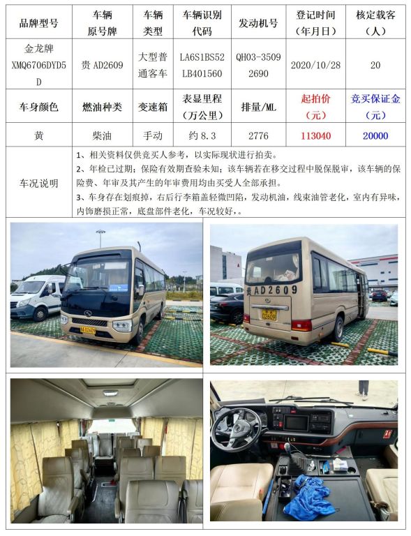 拍品編號4:金龍牌XMQ6706DYD5D大型普通客車一輛