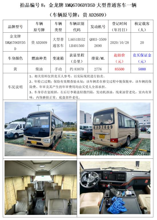 6、金龍牌XMQ6706DYD5D大型普通客車(chē)1輛。
