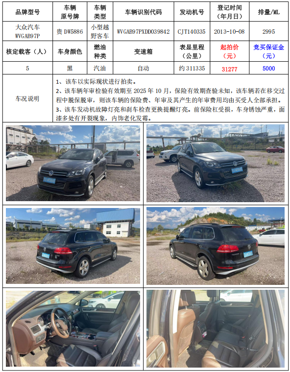 拍品編號(hào)1:大眾汽車WVGAB97P小型越野客車1輛(車輛原號(hào)牌:貴DW5886)