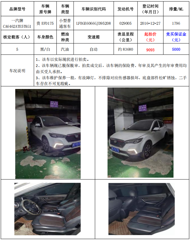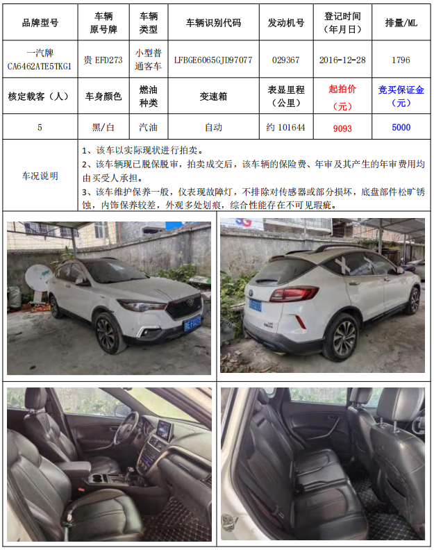 拍品編號(hào)1:一汽牌CA6462ATE5TKG1小型普通客車1輛(車輛原號(hào)牌:貴EFD271)