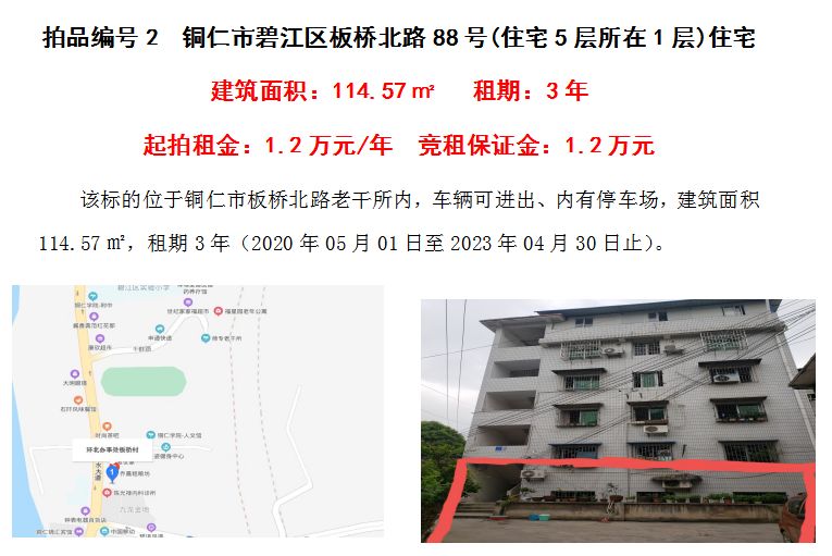 2、銅仁市碧江區(qū)板橋北路88號(hào)(住宅5層所在1層)住宅3年租賃權(quán)(建筑面積:114.57㎡);起拍租金單價(jià):1.20萬元/年;競(jìng)租保證金:1.20萬元;