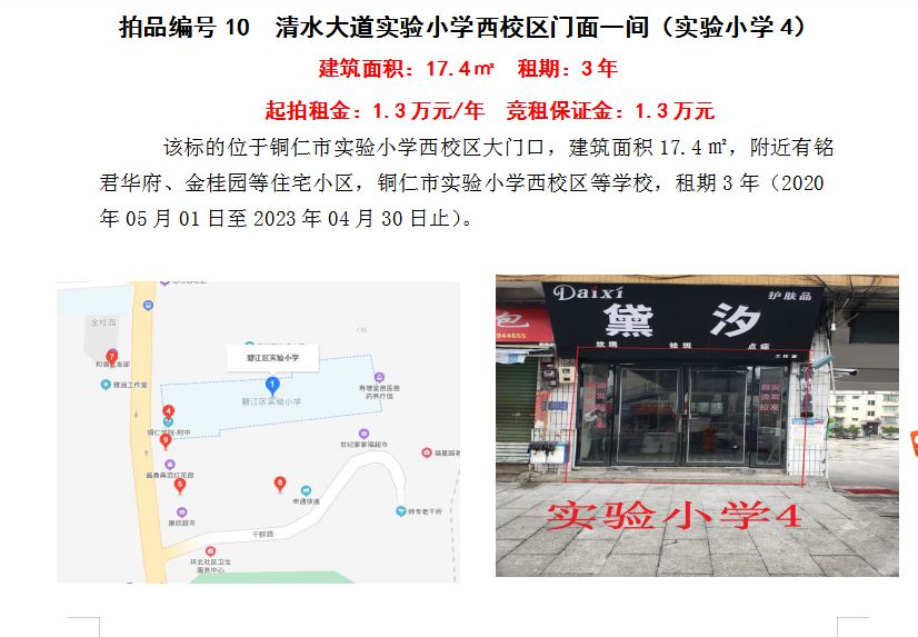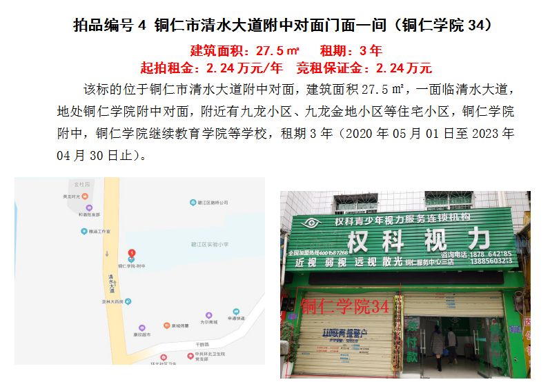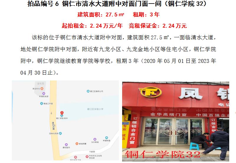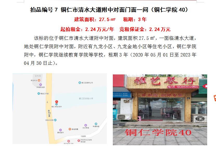 4、銅仁市清水大道附中對(duì)面門面五間3年租賃權(quán)(建筑面積:27.5㎡/間);起拍租金單價(jià)(每間):2.24萬元/年;競(jìng)租保證金(每間):2.24萬元;